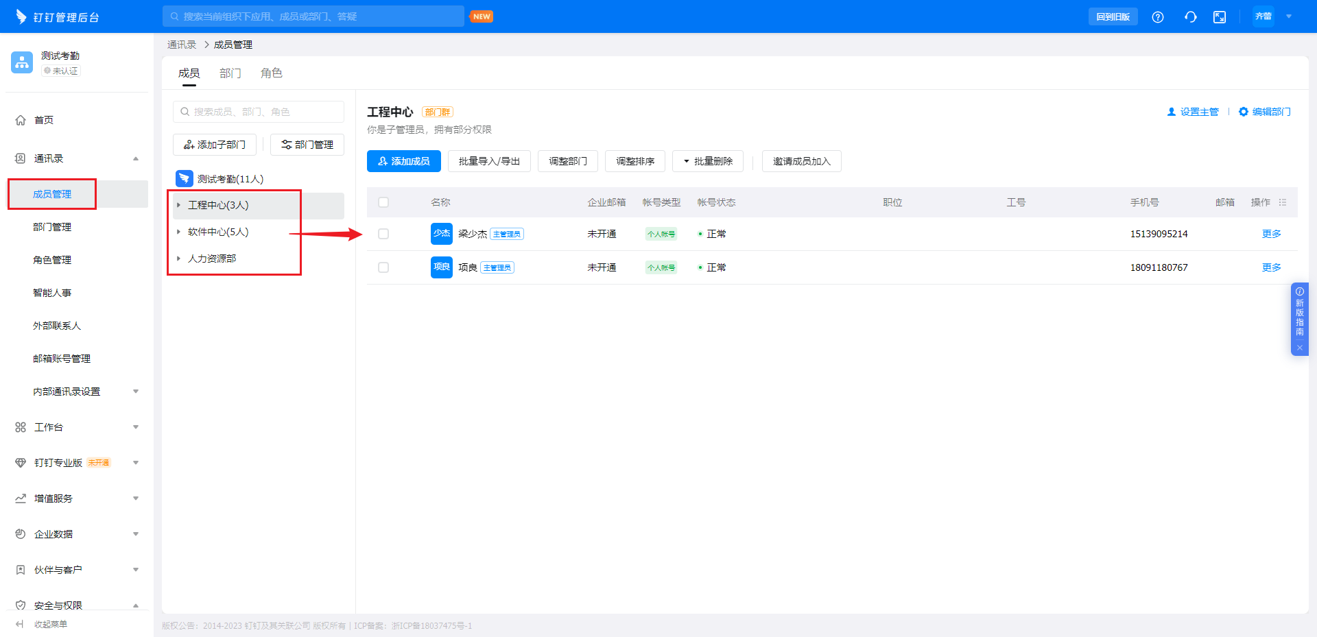 - 配置了钉钉登录后,系统中的部门、用户信息将从钉钉系统中相应的服务中心直接同步过来,账号为钉钉用户的手机号码,密码为默认密码;