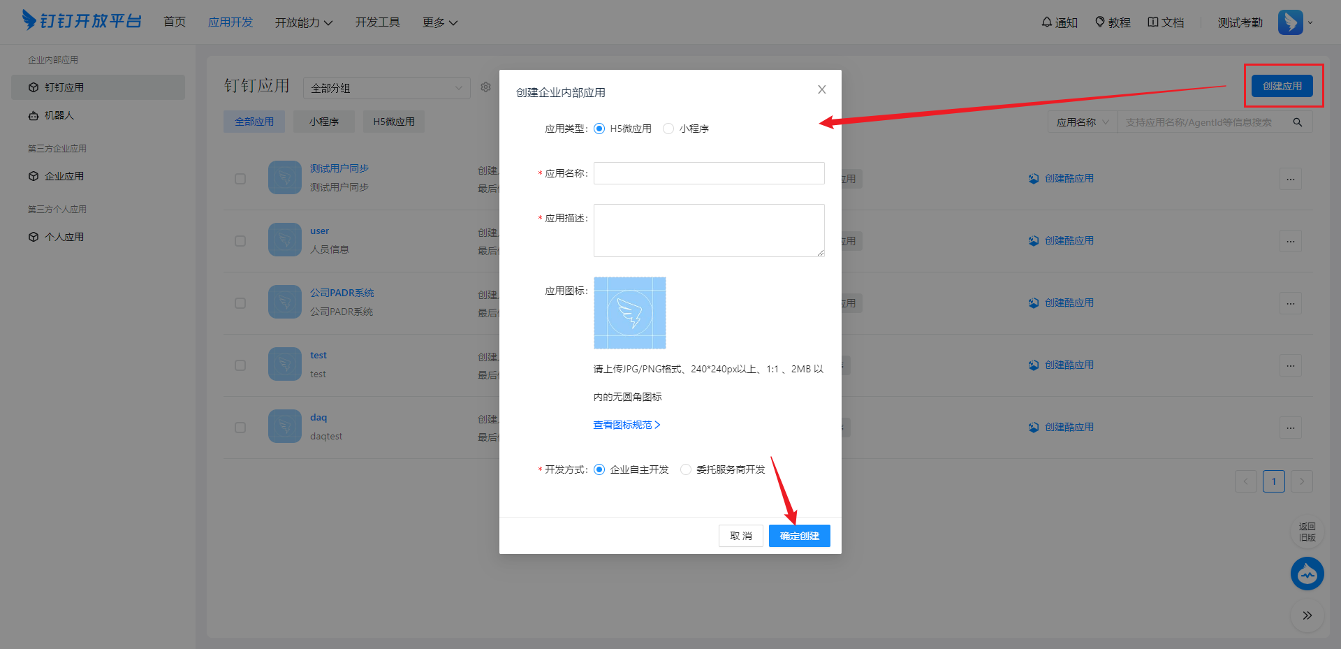 在钉钉开放平台的【应用开发】页面,创建钉钉应用;