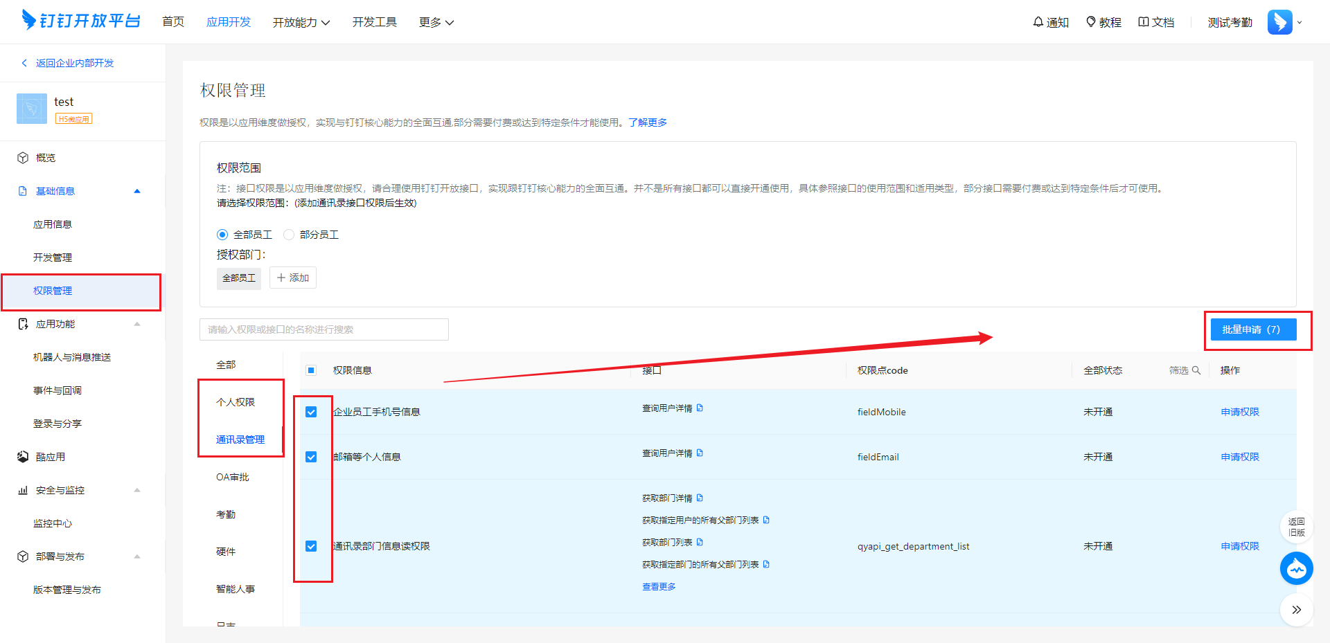 | 通讯录管理 | 1. 企业员工手机号信息 2. 邮箱等个人信息 3. 通讯录部门信息读权限 4. 维护通讯录的接口访问权限 5. 成员信息读权限 6.根据手机号姓名获取成员信息的接口访问权限 7. 通讯录部门成员读权限 8.企业活跃度相关接口的基础调用权限 |