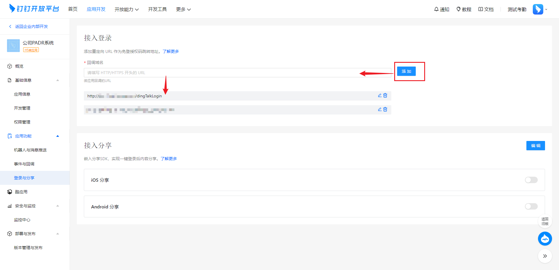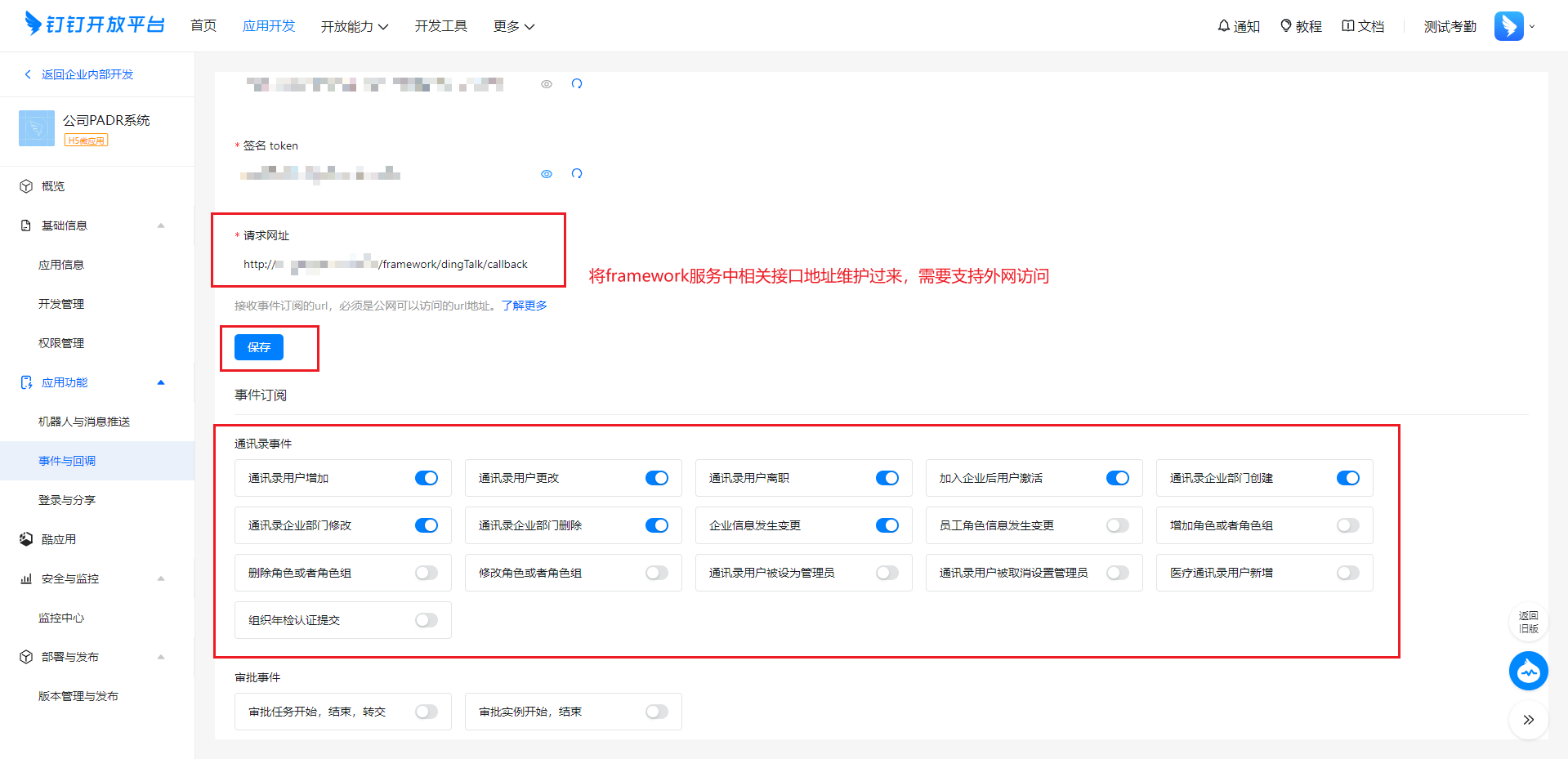 请求网址设置为:域名+“/framework/dingTalk/callback”;(需要支持外网访问)