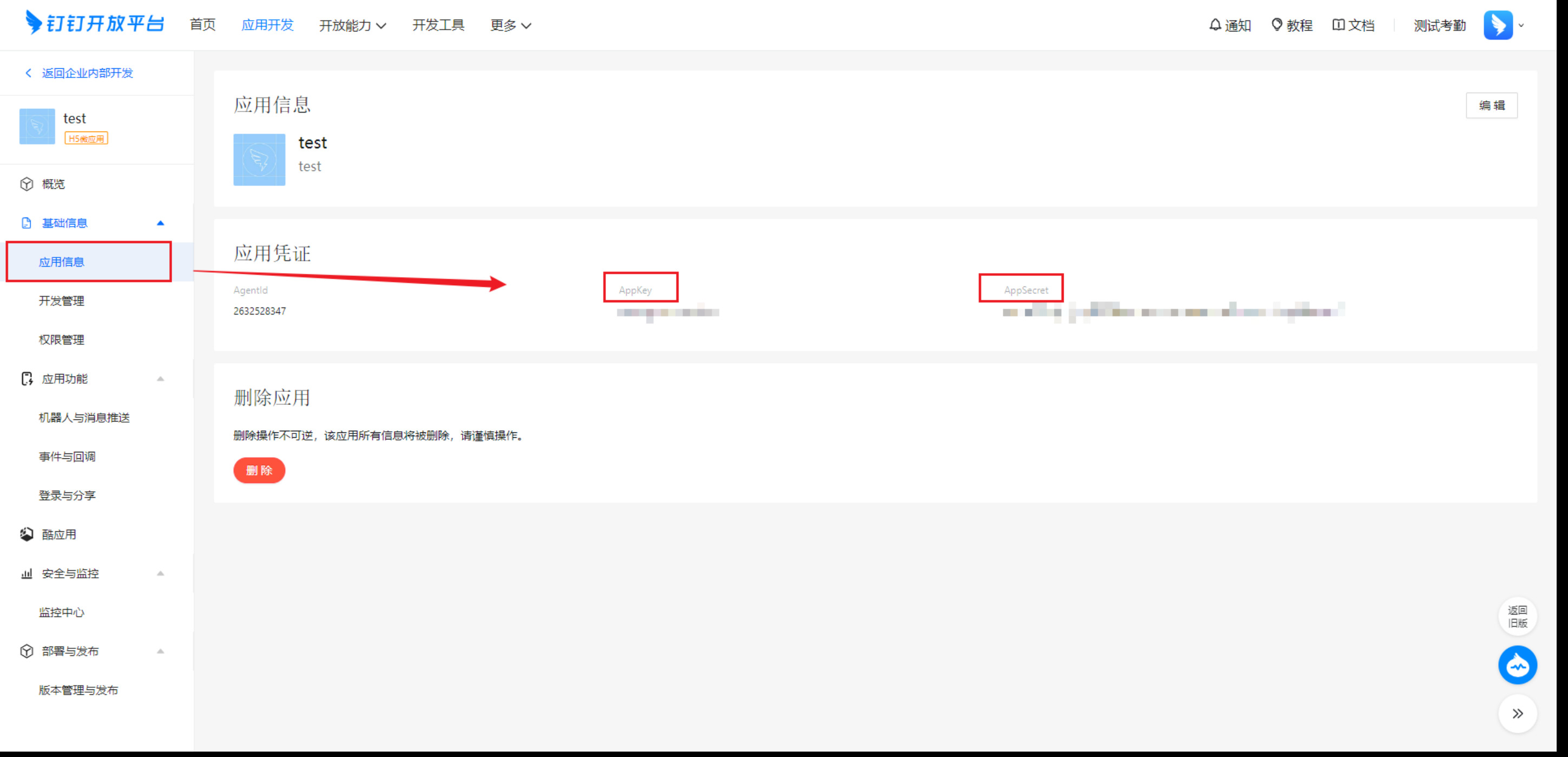 在【应用信息】中获取到:AppKey 和 AppSecret 参数;